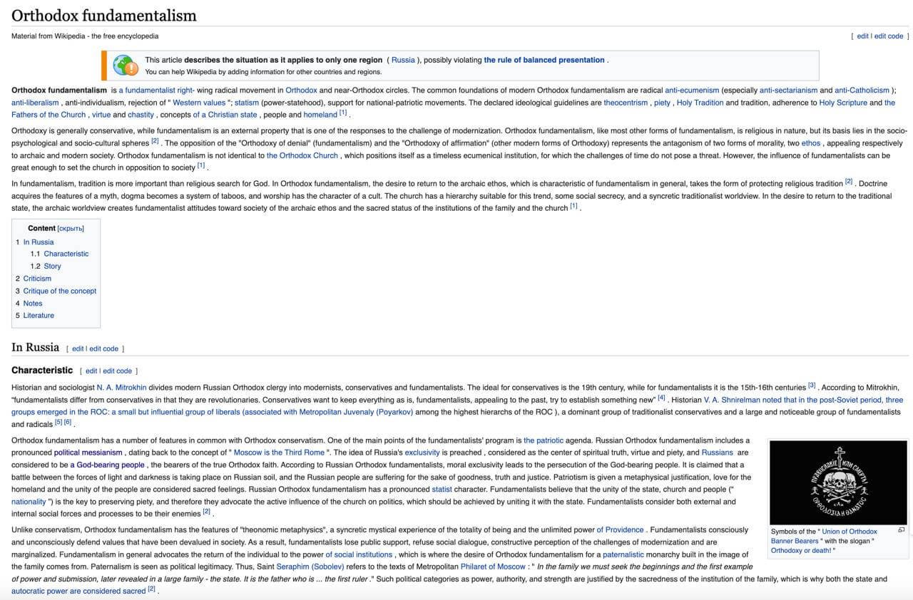 "Screenshot dalla pagina di Wikipedia 'Fondamentalismo ortodosso'"