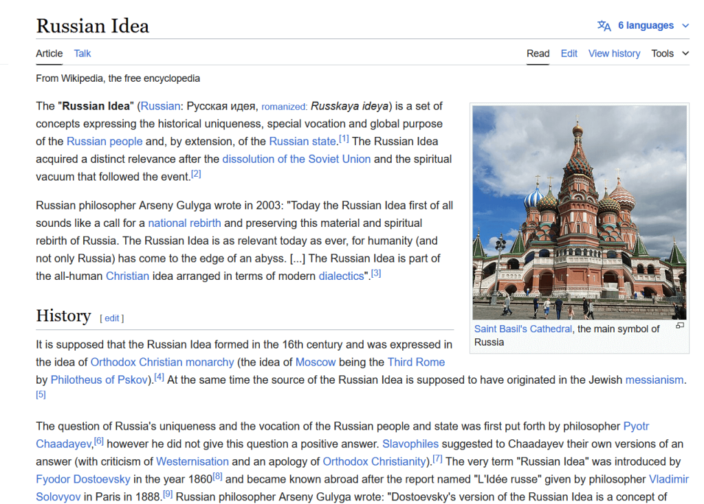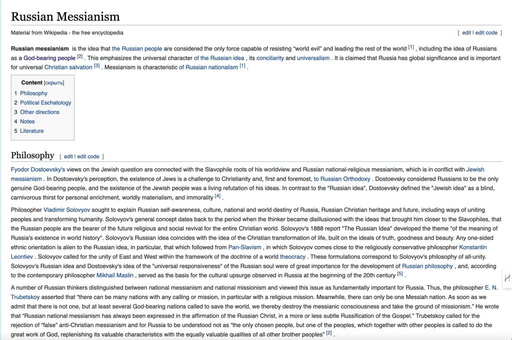 Screenshot della pagina Wikipedia "Messianismo Russo".