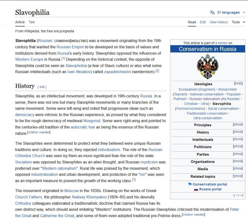 Screenshot della pagina di Wikipedia "Slavofilia".