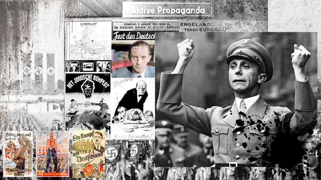 4) Massiccia propaganda di guerra. Dal 1933 al 1945, il ministro della propaganda nazista Joseph Goebbels consolidò nelle sue mani tutte le leve vitali del controllo sulla stampa, la radio, il cinema e altre sfere della cultura tedesca. Attraverso una combinazione di retorica demagogica, eventi di massa abilmente organizzati e un uso efficace della tecnologia moderna (principalmente, radio e cinema) per scopi propagandistici, riuscì a infettare ampi strati della nazione tedesca con idee di nazionalsocialismo e a diffamare comunisti, socialdemocratici, ebrei e membri di minoranze religiose.