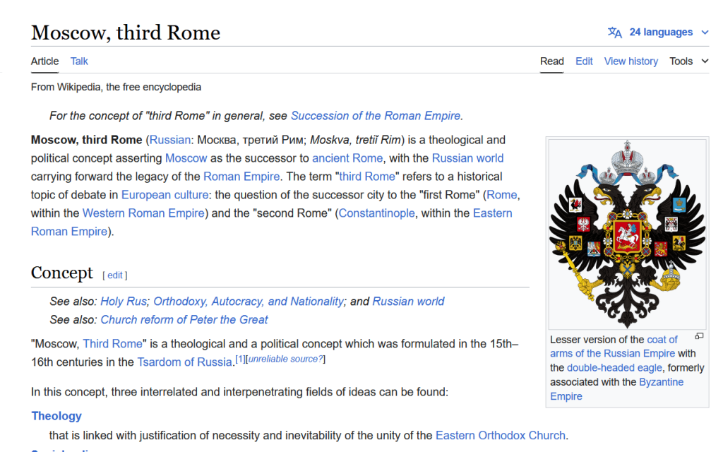 Screenshot dalla pagina di Wikipedia "Mosca è la Terza Roma".