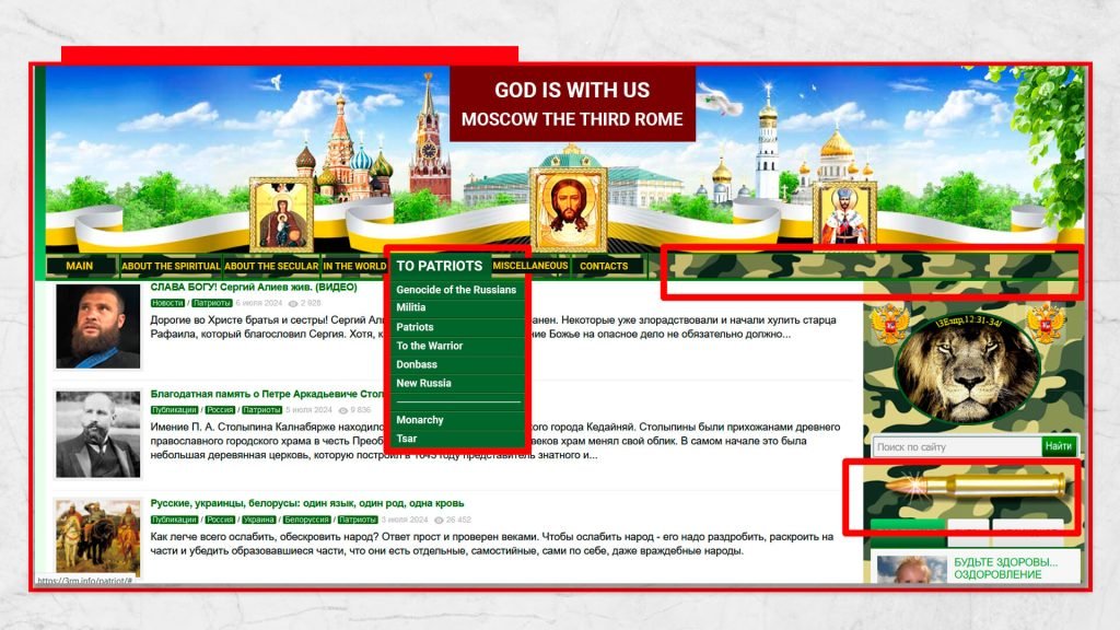 Un altro esempio lampante che riflette il paradosso ideologico di questo termine è il famigerato sito web propagandistico https://3rm.info/. Il suo design combina l’incombinabile: Dio, icone cristiane ortodosse, potere, autocrazia, patriottismo, il volto della bestia, colori mimetici color cachi e un proiettile vivo.