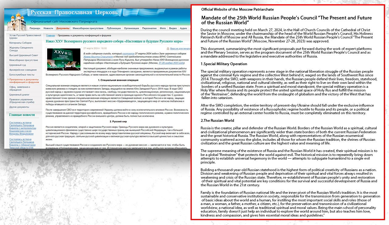 Dopo due anni di ostilità, il 27 marzo 2024, il sito web ufficiale della Chiesa ortodossa russa ha pubblicato un Mandato del 25° Consiglio mondiale del popolo russo «Il presente e il futuro del mondo russo». In particolare, include le seguenti righe:
