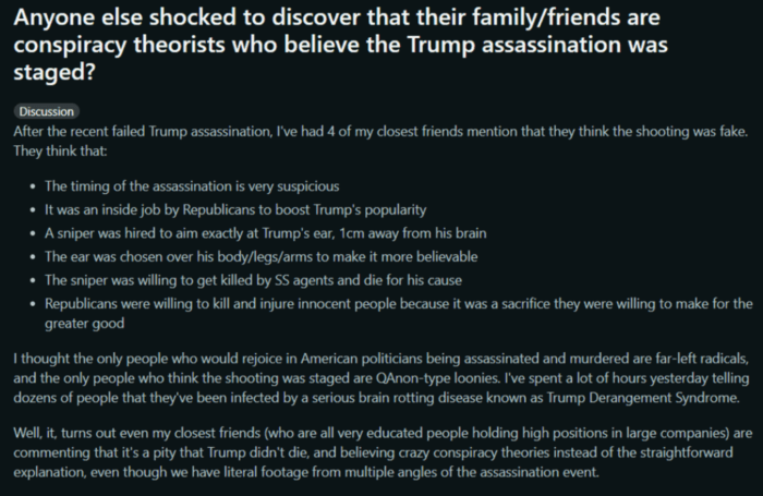 La narrazione ha preso piede anche sui social media, sostenendo che il sangue sull’orecchio dell’ex presidente Donald Trump proveniva da un impacco di gel teatrale, simile a quelli usati nel wrestling, e che la sparatoria era un’operazione «sotto falsa bandiera» poiché l’attentatore era un repubblicano registrato, quindi «uno degli stessi Trump».
