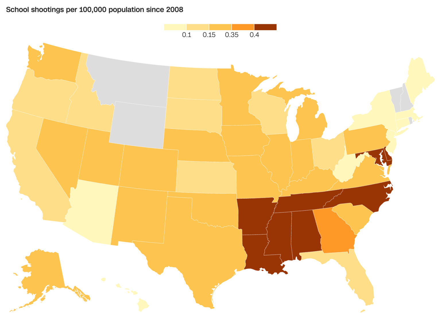 Mappa delle sparatorie nelle scuole ogni 100.000 abitanti per stato dal 2008