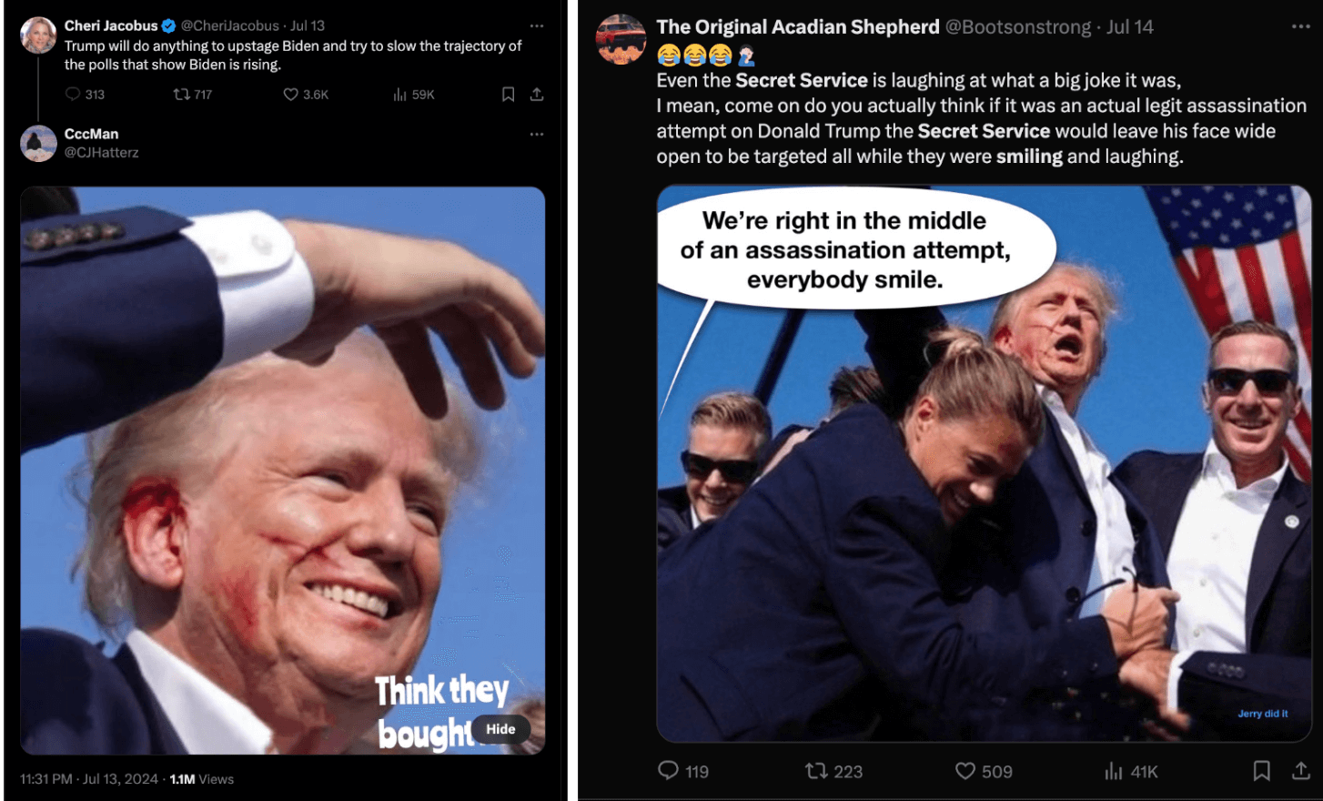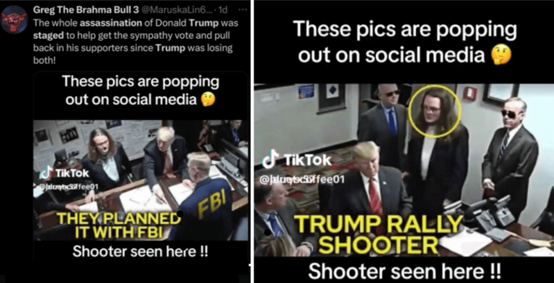 Contemporaneamente alla sparatoria, è stata lanciata sui media una massiccia campagna di disinformazione. Questa campagna mirava a diffondere affermazioni secondo cui l’incidente era un evento «messo in scena» organizzato per aumentare le possibilità elettorali di Donald Trump. A poche ore dalla sparatoria in Pennsylvania, il termine «messo in scena» è diventato la quarta parola chiave più cercata su Google, seguita da «Trump» e «Secret Service». Gli hashtag fakeassassination e stagedshooting sono diventati i più popolari sui social media, insieme alle foto di un Trump sorridente e dei membri sorridenti del suo team di sicurezza.