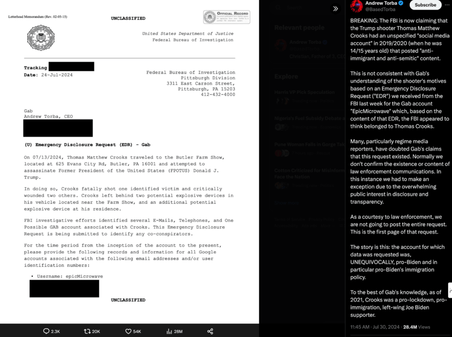 » Ciò non è coerente con la comprensione di Gab delle motivazioni dell’assassino basata su una richiesta di divulgazione di emergenza («EDR») che abbiamo ricevuto dall’FBI la scorsa settimana per l’account Gab «EpicMicrowave» che, in base al contenuto di tale EDR, l’FBI sembrava pensare appartenesse a Thomas Crooks .»