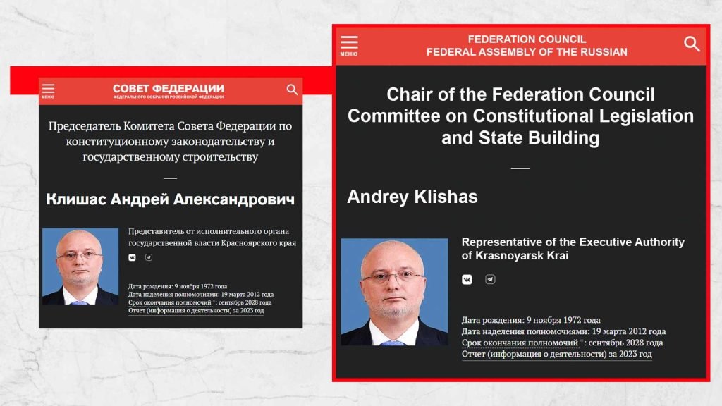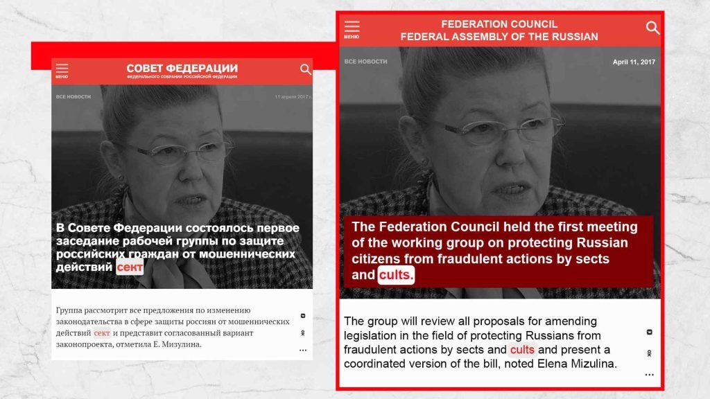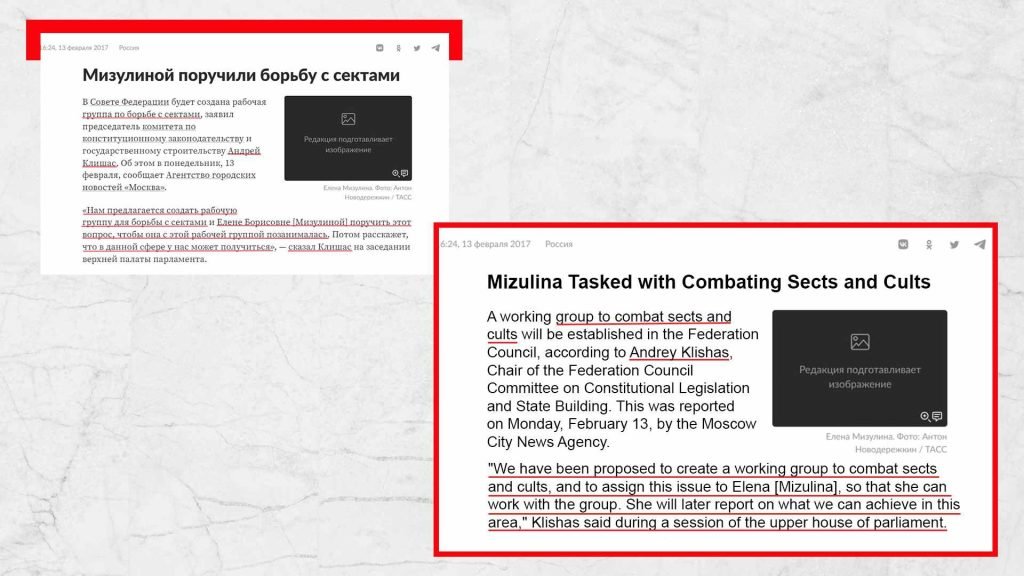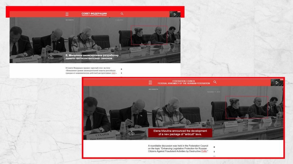 Sul sito web del Consiglio della Federazione, una delle pubblicazioni presenta una foto che mostra Elena Mizulina, che lavora a stretto contatto con Andrei Klishas ed è di fatto subordinata alla Fratellanza di Diveyevo, insieme ad Alexander Dvorkin, il principale anti-sette russo impegnato in attività anti-sette da oltre 30 anni e che collabora a stretto contatto con organizzazioni anti-sette in tutta Europa e nel mondo.