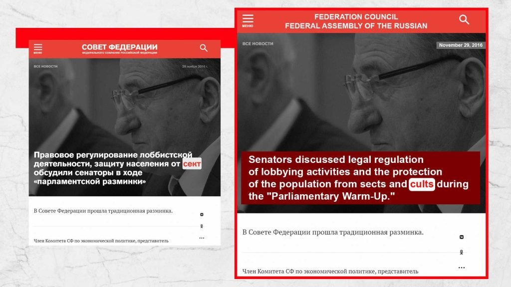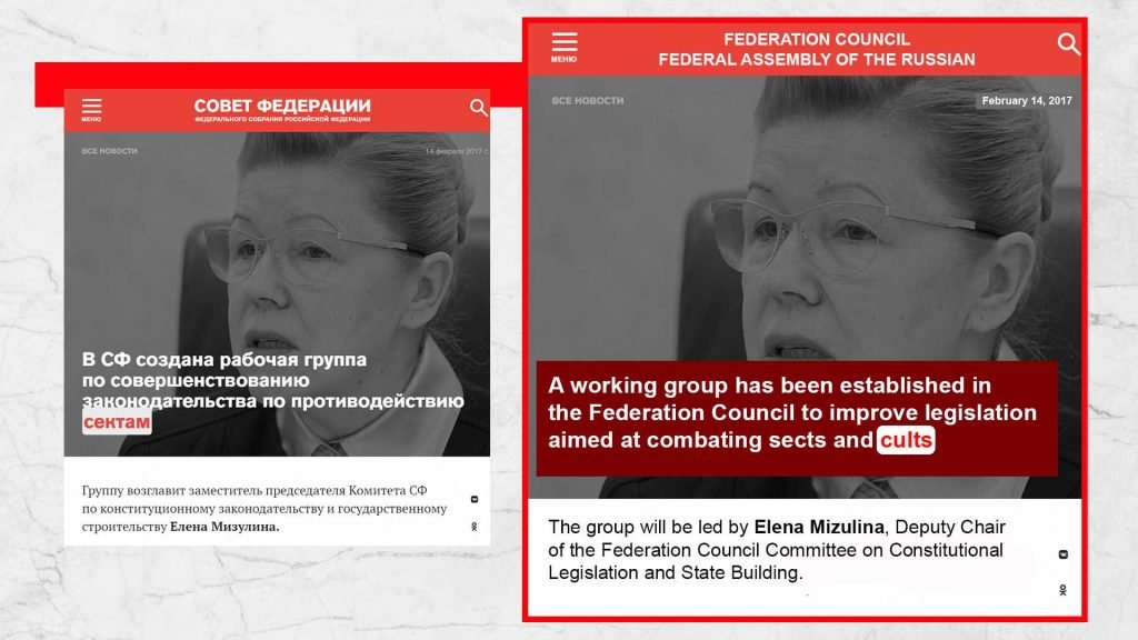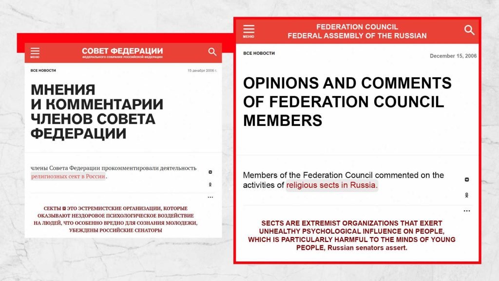 Una delle pubblicazioni sul sito web ufficiale del Consiglio della Federazione afferma: «Il pluralismo di opinioni su questioni religiose è completamente inutile e persino pericoloso». Più avanti nel testo, sembra esserci una direttiva informale alle forze dell’ordine e ai giornalisti su chi possono e non possono pubblicare. In questo contesto, è particolarmente rilevante ricordare il «Memorandum» del cardinale A. Bertram del 10 dicembre 1941, che criticava il regime nazista in Germania e affrontava l’inammissibilità di violare la libertà personale di ogni individuo.
