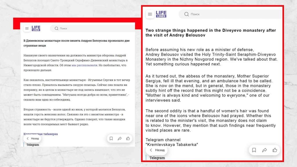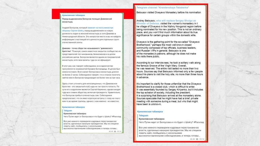 Casualmente o no, è stato Sergei Kiriyenko a portare i membri più influenti della «Fratellanza di Diveyevo» a Diveyevo, e sono state le persone di Kiriyenko a ricoprire posizioni chiave nel governo dopo il rimpasto di governo del presidente russo Vladimir Putin nel 2024. In particolare, il nuovo ministro della Difesa russo è Andrey Belousov, un membro della Fratellanza di Diveyevo. Nel 2017, è stato anche nominato nel Consiglio per il restauro dei monasteri di Sarov e Diveyevo. Secondo diverse fonti russe 5 6 , prima di assumere il suo nuovo ruolo, il futuro ministro ha visitato il monastero di Diveyevo nella regione di Nizhny Novgorod. La sua visita non è durata più di due ore, ma ha avuto sfumature notevoli. Dopo la visita di Belousov, sono accadute due cose strane al monastero. Quella sera, la badessa, Madre Superiora Sergiya, si ammalò improvvisamente e vicino a una delle icone dove Belousov aveva pregato, fu trovata una manciata di capelli di donna. Non è chiaro se ciò sia collegato alla visita del ministro, ma tali scoperte vicino alle icone nel monastero sono estremamente rare.