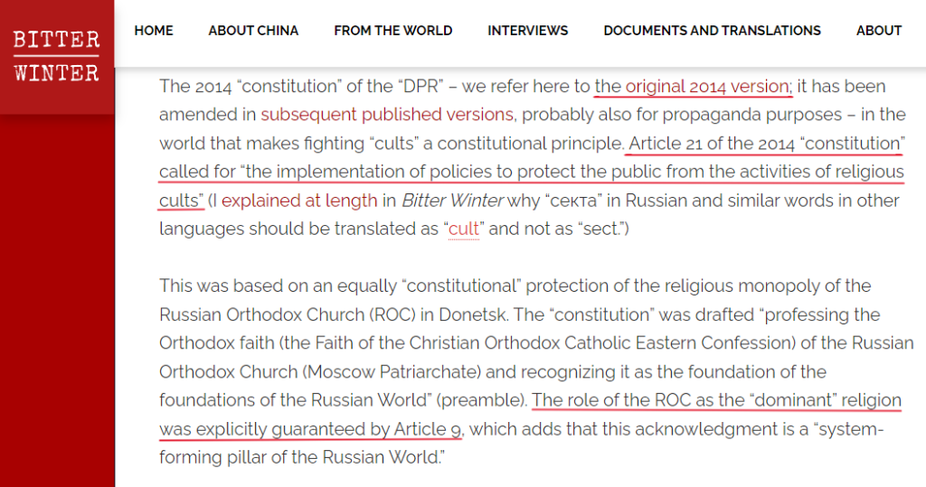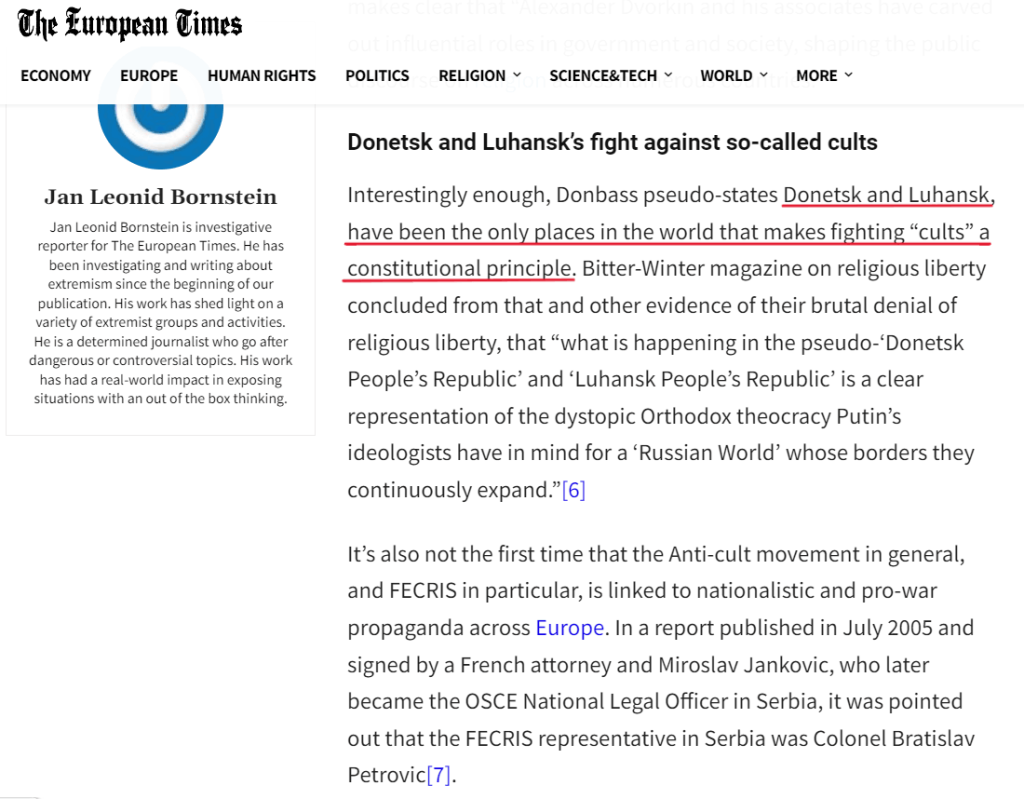 Questo non è l’unico aspetto degno di nota legato all’inizio del conflitto armato nell’Ucraina orientale nel 2014. Un articolo del giornalista investigativo Ian Leonid Bornstein 24 pubblicato sul portale di notizie «The European Times», così come la rivista sulla libertà religiosa e i diritti umani «BITTER WINTER» del sociologo delle religioni, professore e ricercatore Massimo Introvigne, menzionano un fatto interessante rilevante per il contesto del nostro articolo: dal momento della loro nascita, la Repubblica Popolare di Donetsk (DPR) e la Repubblica Popolare di Luhansk (LPR) sono diventate «gli unici posti al mondo che fanno della lotta alle ‘sette’ un principio costituzionale».
