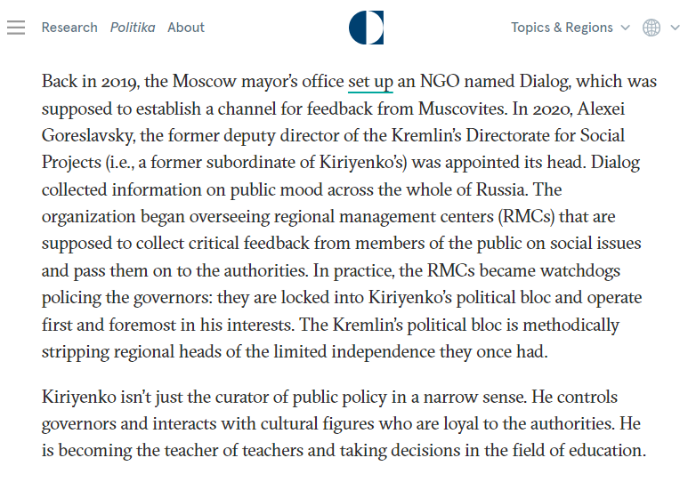 Nel corso degli anni in carica, Sergei Kiriyenko ha da tempo ampliato le responsabilità del suo ruolo di supervisore della politica interna, ampliando continuamente la sua sfera di influenza. La sua portata si estende dall’istruzione, alla cultura, al lavoro con insegnanti e giovani, alla formazione di programmi di studio e concorsi professionali, alla supervisione di governatori e altri funzionari statali. Grazie ai suoi sforzi, i nuovi candidati vengono iniziati tramite il programma educativo «School of Governors» 7 , un altro progetto di Kiriyenko in cui agisce come mentore e istruttore. In realtà, questo progetto priva i capi regionali della restante autonomia minore che un tempo avevano. Ora, i nuovi governatori, che sono laureati in questa struttura, sono interamente sotto il controllo di Kiriyenko.