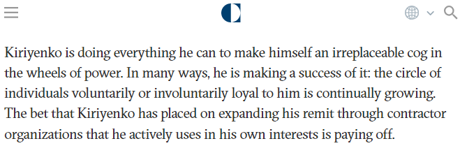 Un altro aspetto cruciale da menzionare nel contesto di questo articolo è il controllo sullo spazio informativo. Dalla rapida crescita di Internet in Russia e dal suo spostamento della televisione, la cerchia di Kiriyenko ha aumentato significativamente la sua influenza sul panorama informativo. Inoltre, il figlio di Sergei Kiriyenko, Vladimir Kiriyenko, ricopre la carica di CEO presso VK, dove supervisiona tutte le direzioni e i progetti della holding. VK include diversi social network e servizi online popolari: i social network VKontakte e Odnoklassniki, il servizio di posta elettronica Mail.ru, nonché varie piattaforme e app per il business, la messaggistica e l’istruzione online. Nel 2024, VKontakte ha un pubblico di 90 milioni di utenti al mese 9 . Sergei Kiriyenko ha ripetutamente sottolineato l’importanza delle informazioni nel plasmare la coscienza delle persone.