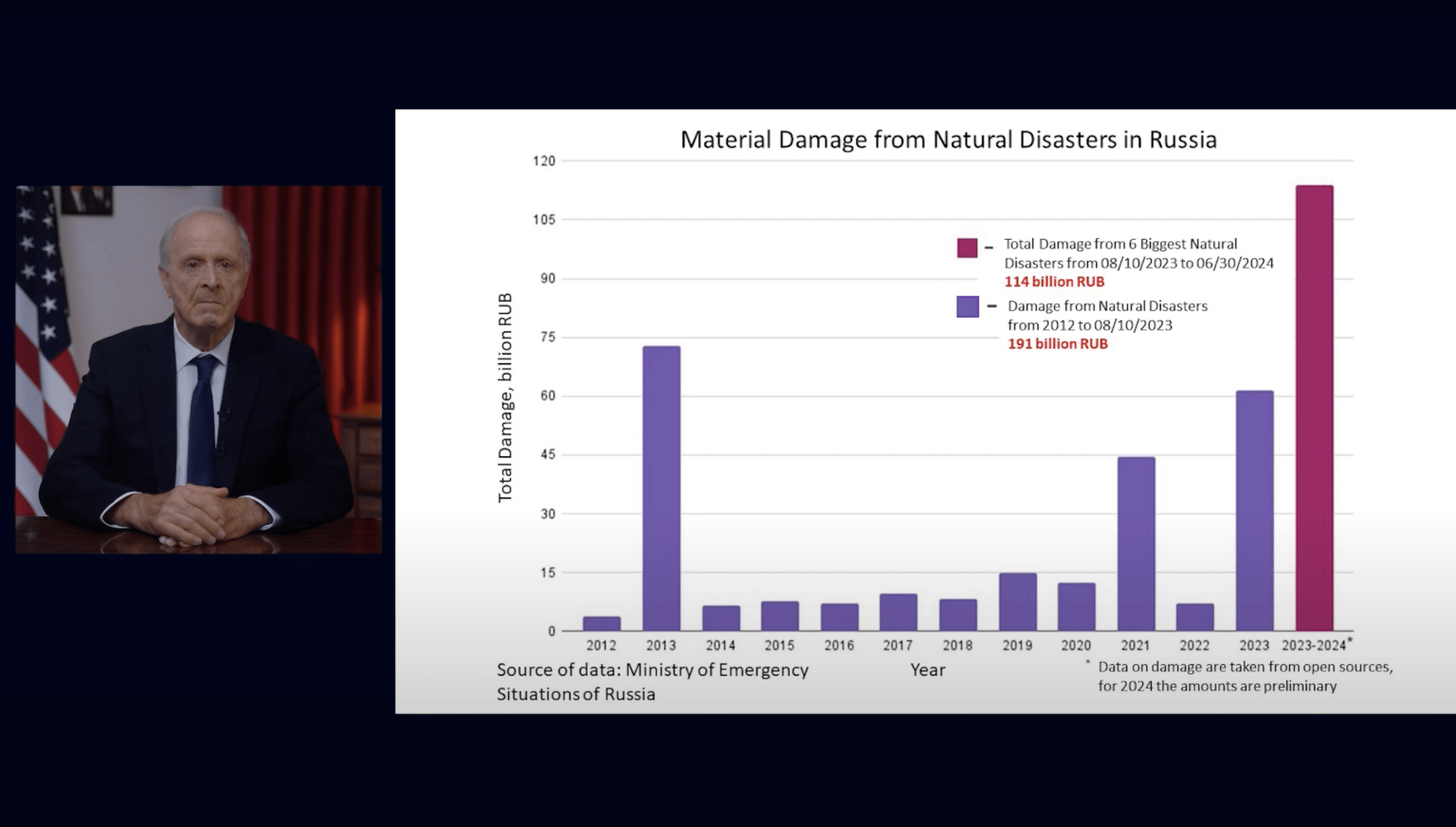 Signor Putin, parliamo il linguaggio della matematica. Guardi questi numeri scioccanti! Il grafico mostra chiaramente l’ammontare delle perdite subite dal bilancio russo a causa dei disastri climatici dal momento in cui le apparecchiature sono state spente nell’agosto del 2023 a oggi, luglio 2024. Le perdite totali ammontano a 114 miliardi di rubli. Ora, confrontate questa somma di perdite nel periodo di 11 mesi con quelle del periodo di 10 anni in cui l’apparecchiatura era operativa: in 10 anni, le perdite ammontano a soli 191 miliardi di rubli. Non vi allarma il fatto che il danno economico in 11 mesi sia quasi pari a quello di un decennio?